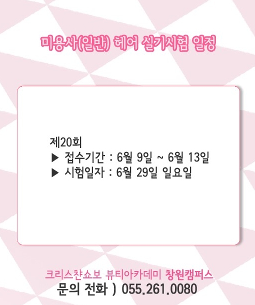 2014년 6월 미용시험일정 - 미용사(헤어) 국가자격증 실기시험 페이지 정보 작성자 크리스챤쇼보 작성일14-06-04 12:53 조회33,759회 댓글0건 관련링크 이전글 다음글 목록 본문 - 크리스챤쇼보 - 2014년 6월 미용시험일정 - 미용사(헤어) 국가자격증 실기시험제 20 회접수기간 : 6월 9일 ~ 6월 13일시험일자 : 6월 29일 일요일크리스챤쇼보 뷰티아카데미 창원캠퍼스055 - 261 - 0080 댓글목록 등록된 댓글이 없습니다. 이전글 다음글 목록