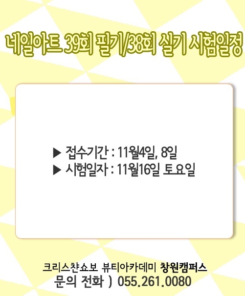 11월 시험일정 - 네일아트 시험일정 페이지 정보 작성자 크리스챤쇼보 작성일13-11-04 10:43 조회26,428회 댓글0건 관련링크 이전글 다음글 목록 본문 크리스챤쇼보 - 11월 시험일정제 39회 필기 / 38회 실기시험 일정접수기간 : 11월 4일 월요일 ~ 8일 금요일시험일자 : 11월 16일 토요일크리스챤쇼보 뷰티아카데미 창원캠퍼스055 - 261 - 0080 댓글목록 등록된 댓글이 없습니다. 이전글 다음글 목록