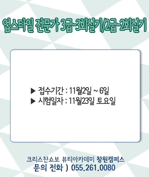 11월 시험일정 - 업스타일 실기시험 일정 페이지 정보 작성자 크리스챤쇼보 작성일13-11-07 12:12 조회26,739회 댓글0건 관련링크 이전글 다음글 목록 본문 크리스챤쇼보 - 11월 시험일정업스타일 전문가 3급 - 3회 / 2급 - 2회 실기시험 일정접수기간 : 11월 2일 토요일 ~ 6일 ㅅ요일시험일자 : 11월 23일 토요일크리스챤쇼보 뷰티아카데미 창원캠퍼스055 - 261 - 0080 댓글목록 등록된 댓글이 없습니다. 이전글 다음글 목록