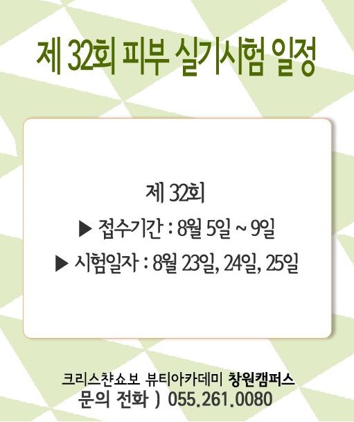 8월 피부 실기시험 일정 페이지 정보 작성자 크리스챤쇼보 작성일13-07-25 11:19 조회35,964회 댓글0건 관련링크 이전글 다음글 목록 본문 크리스챤쇼보 - 8월 피부 실기시험 일정#제 32회 피부 실기시험 일정#접수기간 : 8월 5일 월요일 ~ 8월 9일 금요일시험일자 : 8월 23일 금요일, 24일 토요일, 25일 일요일크리스챤쇼보 뷰티아카데미 창원캠퍼스055 - 261 - 0080 댓글목록 등록된 댓글이 없습니다. 이전글 다음글 목록
