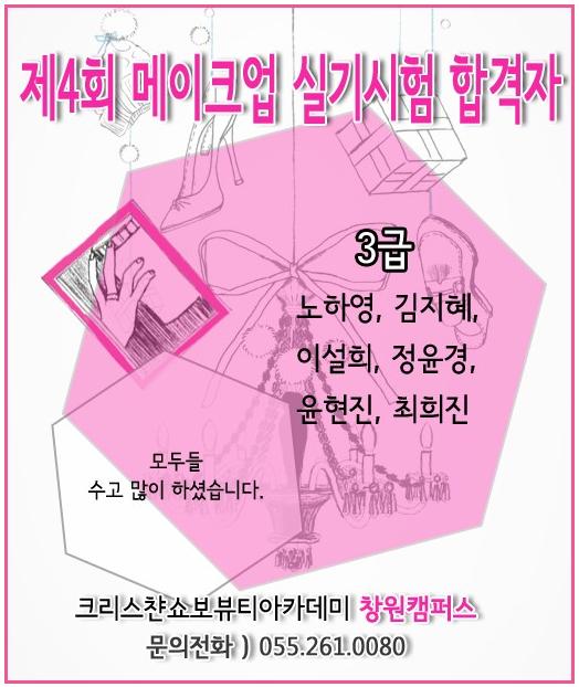 제4회 메이크업 3급 실기시험 합격자 페이지 정보 작성자 크리스챤쇼보 작성일13-03-12 16:52 조회30,789회 댓글0건 관련링크 이전글 다음글 목록 본문 2013년 제4회 메이크업 실기시험 합격자3급▷노하영, 김지혜, 이설희, 정윤경, 윤현진, 최희진합격한 모든 학생분들 수고많으셨습니다. 축하드립니다^^크리스챤쇼보 창원점055)261-0080 댓글목록 등록된 댓글이 없습니다. 이전글 다음글 목록