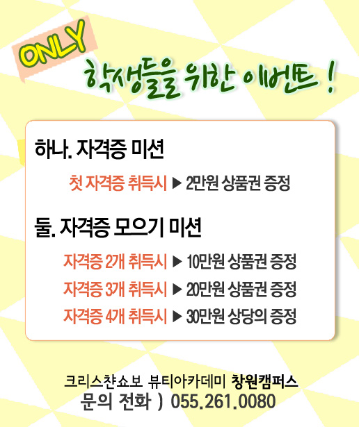 크리스챤쇼보 - ONLY 학생들을 위한 자격증 이벤트 ! 페이지 정보 작성자 크리스챤쇼보 작성일12-09-26 16:43 조회34,628회 댓글0건 관련링크 이전글 다음글 목록 본문 크리스챤쇼보 - ONLY 학생들을 위한 자격증 이벤트 !!많이 참석해주세요.크리스챤쇼보 뷰티아카데미 창원캠퍼스055 - 261 - 0080 댓글목록 등록된 댓글이 없습니다. 이전글 다음글 목록