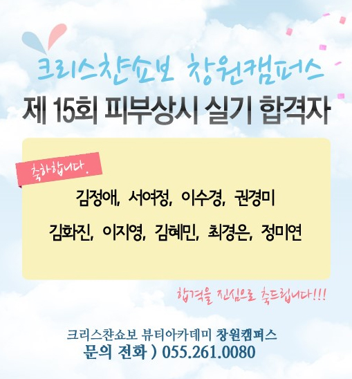 제15회 피부상시 실기 합격자 페이지 정보 작성자 크리스챤쇼보 작성일12-05-25 13:40 조회27,688회 댓글0건 관련링크 이전글 다음글 목록 본문 합격을 진심으로 축하드립니다.^^크리스챤쇼보 뷰티아카데미 창원캠퍼스문의전화)055.261.0080 댓글목록 등록된 댓글이 없습니다. 이전글 다음글 목록