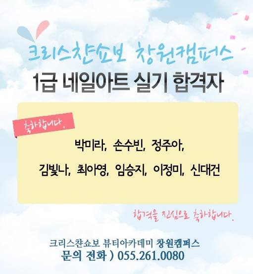 1급 네일아트 실기 합격자!! 페이지 정보 작성자 크리스챤쇼보 작성일12-05-30 13:41 조회27,889회 댓글0건 관련링크 이전글 다음글 목록 본문 합격을 진심으로 축하드립니다.^^크리스챤쇼보 뷰티아카데미 창원캠퍼스문의전화)055.261.0080 댓글목록 등록된 댓글이 없습니다. 이전글 다음글 목록
