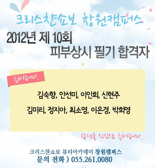 제10회 피부상시 필기 합격자 페이지 정보 작성자 크리스챤쇼보 작성일12-06-15 12:52 조회27,568회 댓글0건 관련링크 이전글 다음글 목록 본문 제 10회 피부 상시 필기 합격자합격을 진심으로 축하합니다 ^^ 댓글목록 등록된 댓글이 없습니다. 이전글 다음글 목록