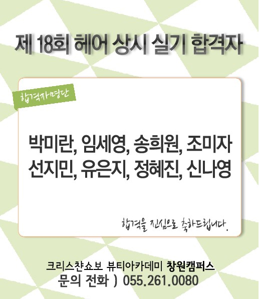 제 18회 헤어상시 실기 합격자 페이지 정보 작성자 크리스챤쇼보 작성일12-06-21 10:35 조회27,504회 댓글0건 관련링크 이전글 다음글 목록 본문 제 18회 헤어상시 실기 합격자박미란, 임세영, 송희원, 조미자선지민, 유은지, 정혜진, 신나영진심으로 축하합니다 ! 댓글목록 등록된 댓글이 없습니다. 이전글 다음글 목록