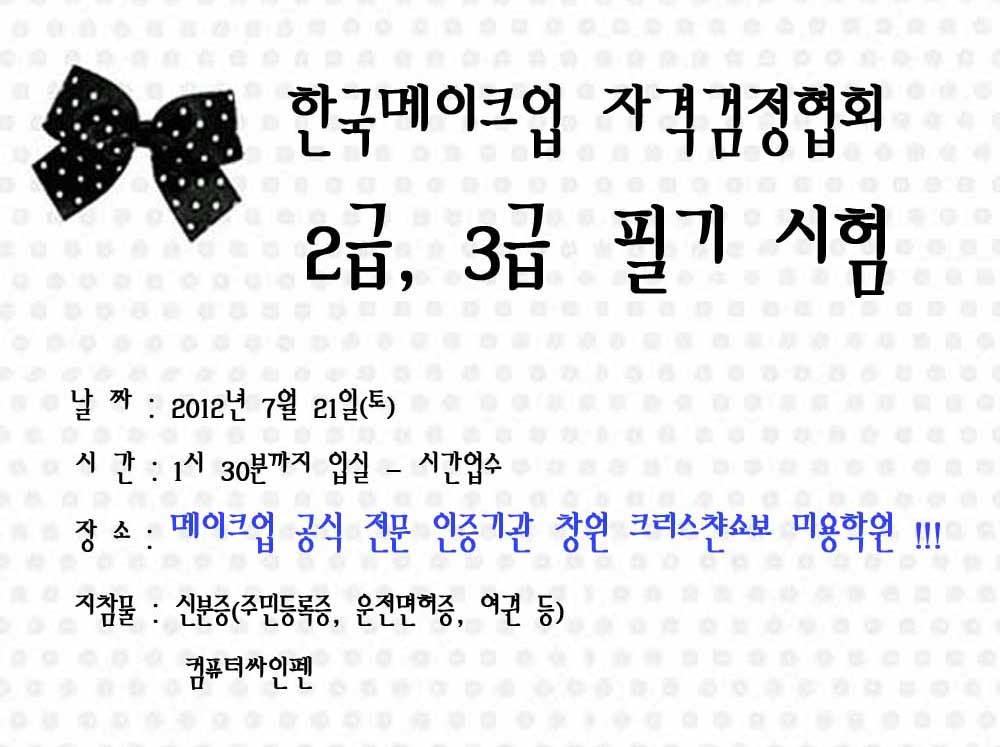 한국메이크업자격검정협회 2급 3급 필기시험 페이지 정보 작성자 크리스챤쇼보 작성일12-07-19 13:06 조회27,883회 댓글0건 관련링크 이전글 다음글 목록 본문 한국메이크업자격검정협회 2급 3급 필기시험 공지! 댓글목록 등록된 댓글이 없습니다. 이전글 다음글 목록