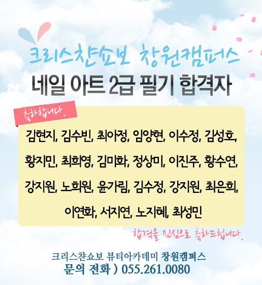 네일아트 2급 필기시험 합격자 명단!! 페이지 정보 작성자 크리스챤쇼보 작성일12-05-23 11:33 조회27,819회 댓글0건 관련링크 이전글 다음글 목록 본문 합격을 진심으로 축하드립니다.^^크리스챤쇼보 뷰티아카데미 창원캠퍼스문의전화)055.261.0080 댓글목록 등록된 댓글이 없습니다. 이전글 다음글 목록
