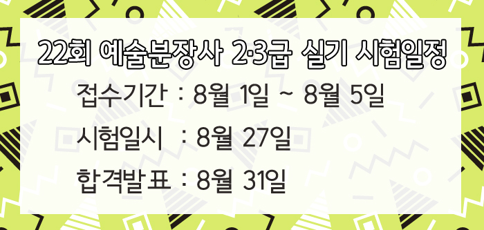 22회 예술분장사 2·3급 실기 시험일정 페이지 정보 작성자 크리스챤쇼보 작성일16-07-27 14:55 조회32,176회 댓글0건 관련링크 이전글 다음글 목록 본문 22회 예술분장사 2·3급 실기 시험일정을 안내드립니다접수기간 : 8월 1일~8월 5일시험일시 : 8월 27일합격발표 : 8월 31일창원미용학원 크리스챤쇼보055 261 0080 댓글목록 등록된 댓글이 없습니다. 이전글 다음글 목록