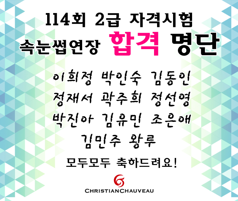 114회 가속눈썹 2급 자격증 시험 합격자 페이지 정보 작성자 크리스챤쇼보 작성일16-08-12 15:59 조회32,088회 댓글0건 관련링크 이전글 다음글 목록 본문 합격하신 모든 분들 축하합니다!!창원미용학원 크리스챤쇼보055 261 0080 댓글목록 등록된 댓글이 없습니다. 이전글 다음글 목록