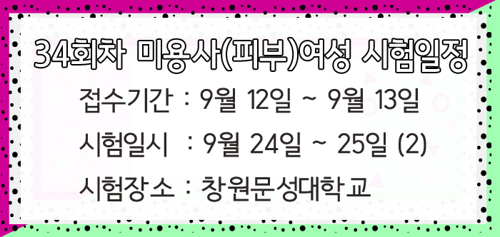34회차 미용사(피부)여성 시험일정 페이지 정보 작성자 크리스챤쇼보 작성일16-08-12 16:05 조회33,170회 댓글0건 관련링크 이전글 다음글 목록 본문 34회차 미용사(피부)여성 시험일정을 안내드립니다.접수기간 : 9월 12일 ~ 9월 13일시험일시 : 9월 24일 ~ 25일(2)시험장소 : 창원문성대학교창원미용학원 크리스챤쇼보055 261 0080 댓글목록 등록된 댓글이 없습니다. 이전글 다음글 목록
