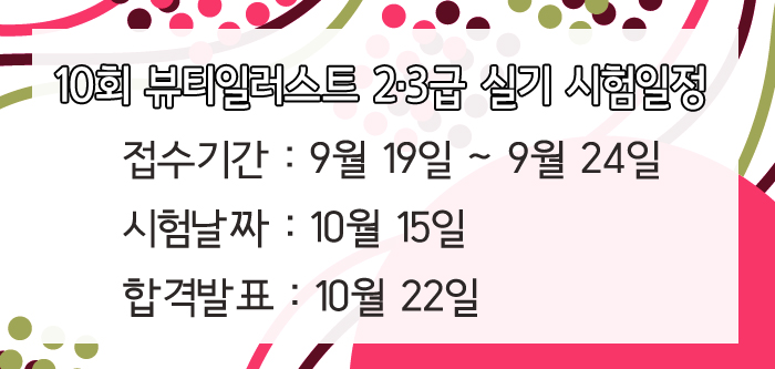 10회 뷰티일러스트 일정을 안내드립니다. 페이지 정보 작성자 크리스챤쇼보 작성일16-08-29 16:53 조회33,776회 댓글0건 관련링크 이전글 다음글 목록 본문 10회 뷰티일러스트 2·3급 실기 시험일정을 안내드립니다.접수기간 : 9월 19일 ~ 9월 24일시험날짜 : 10월 15일합격발표 : 10월 22일창원미용학원 크리스챤쇼보055 261 0080 댓글목록 등록된 댓글이 없습니다. 이전글 다음글 목록