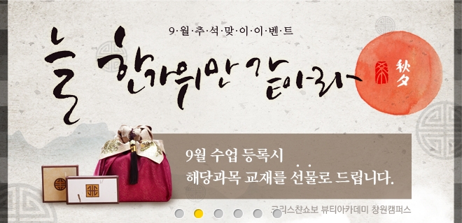★ 9월 이벤트 페이지 정보 작성자 크리스챤쇼보 작성일16-09-02 15:12 조회36,177회 댓글0건 관련링크 이전글 다음글 목록 본문 9월 추석맞이 이벤트! 9월 수업 등록 시 해당과목 교재를 선물로 드립니다!창원미용학원 크리스챤쇼보055 261 0080 댓글목록 등록된 댓글이 없습니다. 이전글 다음글 목록