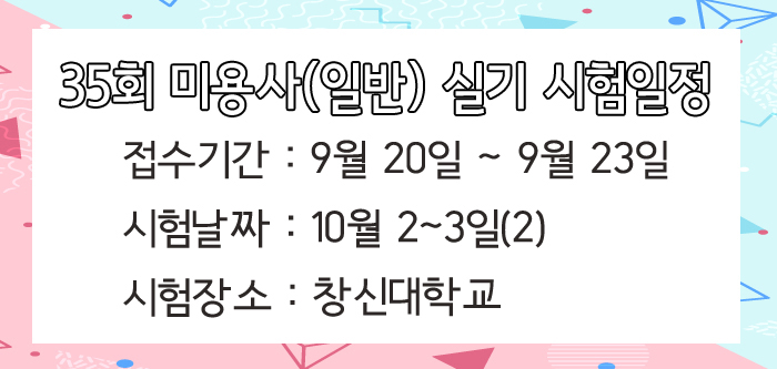 35회 미용사(일반) 실기 시험일정 페이지 정보 작성자 크리스챤쇼보 작성일16-09-06 12:13 조회35,417회 댓글0건 관련링크 이전글 다음글 목록 본문 35회 미용사(일반) 실기 시험일정을 안내드립니다.접수기간 : 9월 20일 ~ 9월 23일시험일시 : 10월 2~3일(2)시험장소 : 창신대학교창원미용학원 크리스챤쇼보055 261 0080 댓글목록 등록된 댓글이 없습니다. 이전글 다음글 목록