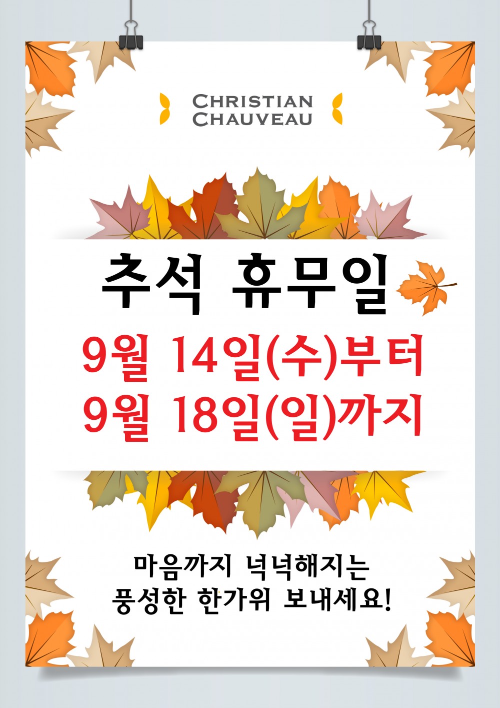 ☆추석 휴무일☆ 페이지 정보 작성자 크리스챤쇼보 작성일16-09-13 12:45 조회37,718회 댓글0건 관련링크 이전글 다음글 목록 본문 추석 휴무일 공지합니다.9월 14일(수)부터9월 18일(일)까지풍요롭고 여유로운 한가위 보내세요!창원미용학원 크리스챤쇼보055 261 0080 댓글목록 등록된 댓글이 없습니다. 이전글 다음글 목록