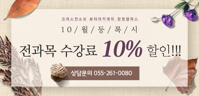♣ 10월 이벤트 페이지 정보 작성자 크리스챤쇼보 작성일16-10-08 12:09 조회39,273회 댓글0건 관련링크 이전글 다음글 목록 본문 창원미용학원크리스챤쇼보 뷰티아카데미 창원캠퍼스10 월 등록하시는 분들에 한해 전.과.목! 수강료 10% 할인 이벤트창원미용학원 크리스챤쇼보055.261.0080 댓글목록 등록된 댓글이 없습니다. 이전글 다음글 목록