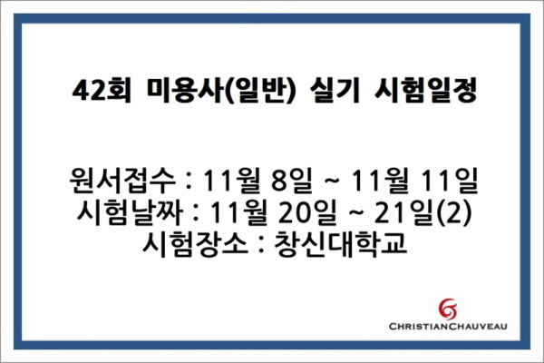 42회 미용사(일반) 실기 시험일정을 안내해드립니다 페이지 정보 작성자 크리스챤쇼보 작성일16-11-09 10:42 조회35,970회 댓글0건 관련링크 이전글 다음글 목록 본문 42회 미용사(일반) 실기 시험일정을 안내해드립니다원서접수 11월 8일 ~ 11월 11일시험날짜 11월 20일 ~ 21일(2)시험장소 창신대학교시험일정확인하시고 준비잘하시길바랍니다^^*창원미용학원 크리스챤쇼보 창원캠퍼스055 261 0080 댓글목록 등록된 댓글이 없습니다. 이전글 다음글 목록