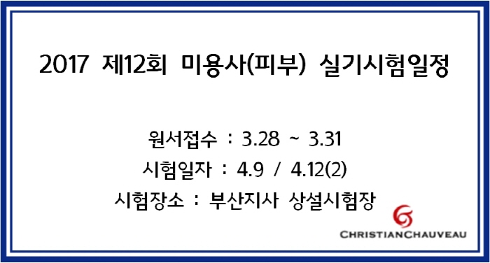 2017 제12회 미용사(피부) 실기시험일정 -부산- 페이지 정보 작성자 크리스챤쇼보 작성일17-03-24 14:57 조회33,088회 댓글0건 관련링크 이전글 다음글 목록 본문 2017 제12회 미용사(피부) 실기시험일정 -부산-원서접수 : 3/28 ~ 3/31시험일자 : 4/9 , 4/12(2)시험장소 : 부산지사 상설시험장창원미용학원 크리스챤쇼보055 261 0080 댓글목록 등록된 댓글이 없습니다. 이전글 다음글 목록