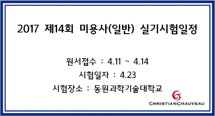 2017 제14회 미용사(일반) 실기시험일정 -울산- 페이지 정보 작성자 크리스챤쇼보 작성일17-04-07 15:16 조회34,173회 댓글0건 관련링크 이전글 다음글 목록 본문 2017 제14회 미용사(일반) 실기시험일정 -울산-원서접수 : 4.11 ~ 4.14시험일자 : 4.23시험장소 : 동원과학기술대학교창원미용학원 크리스챤쇼보055 261 0080 댓글목록 등록된 댓글이 없습니다. 이전글 다음글 목록
