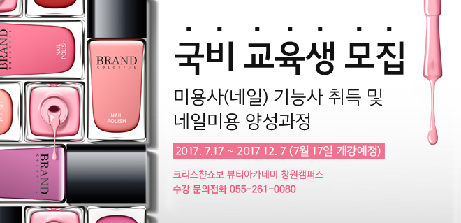 ★국비 교육생 모집 일정★ 페이지 정보 작성자 크리스챤쇼보 작성일17-04-10 16:04 조회33,154회 댓글0건 관련링크 이전글 다음글 목록 본문 < 국비 교육생 모집합니다 >미용사(네일) 기능사 취득 및 네일미용 양성과정 : 7월 17일 개강[2017-07-17 ~ 2017-12-07]많은 문의 바랍니다^^*창원미용학원 크리스챤쇼보055 261 0080 댓글목록 등록된 댓글이 없습니다. 이전글 다음글 목록