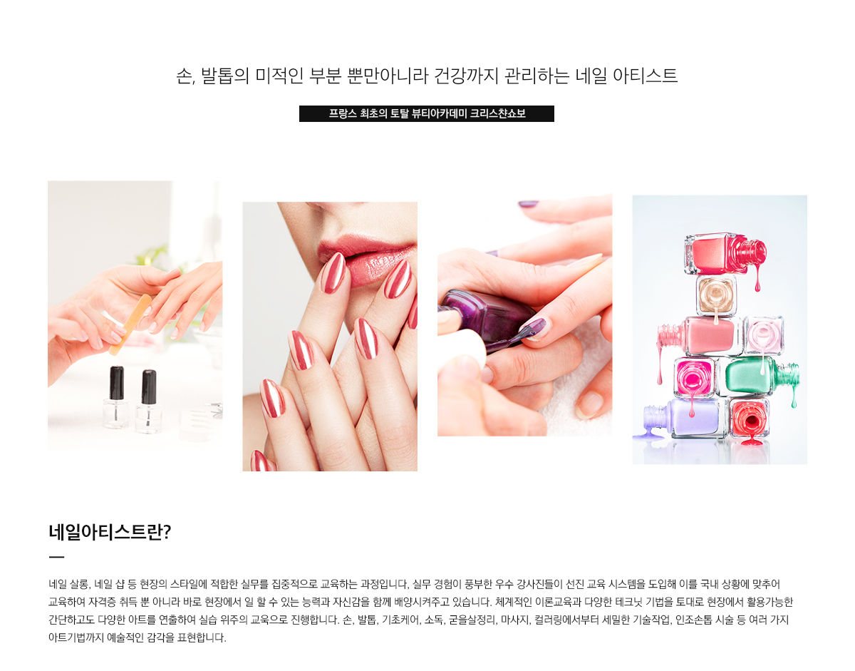 | 9 | 프렌치/그라데이션 컬러링 | 프렌치 종류설명 및 프렌치, 그라데이션 테크닉 습득(인조손톱/상호) | |